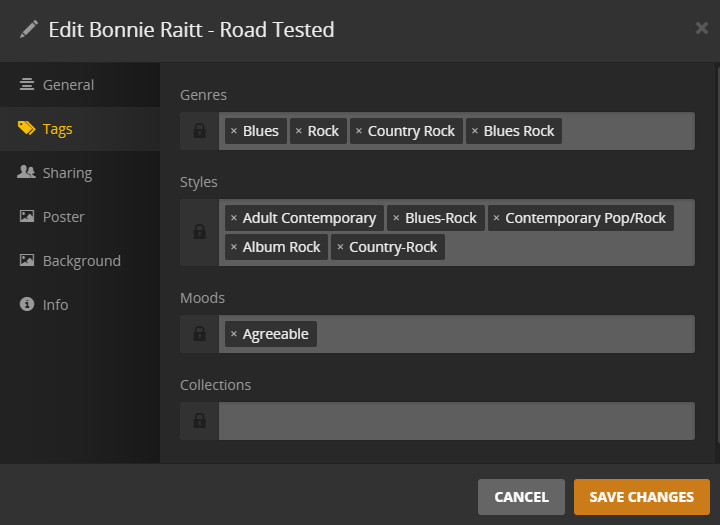 Here’s an example: The album “Road Tested” by Bonnie Raitt. It has four genres picked up by the embedded tags.