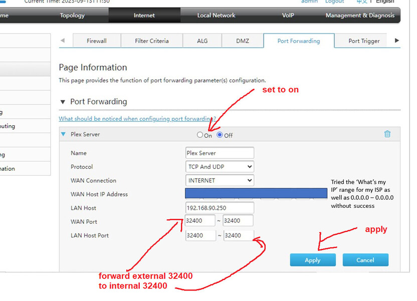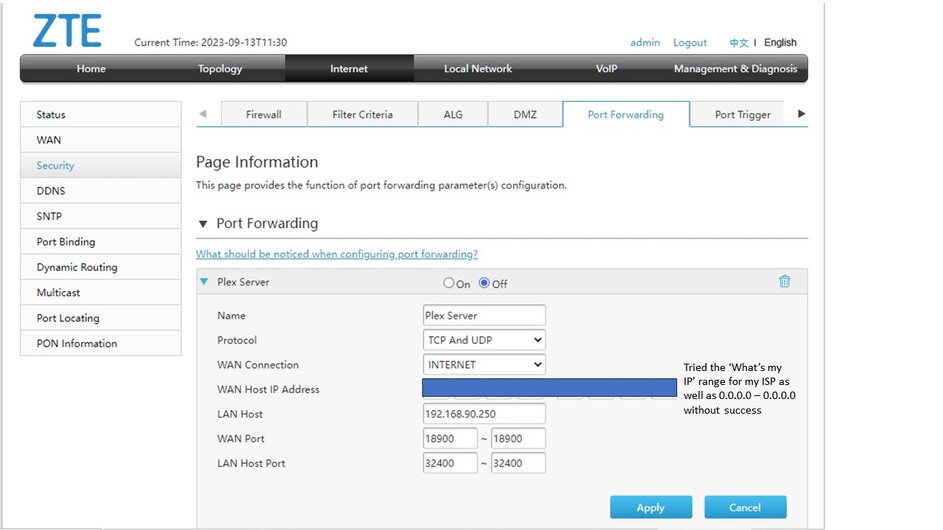 Re the 18900 vs 32400, the 18900 setting was also temporary while trying different options. All ports and ranges on both Plex and Router now set to 32400. I’ve also tracked down the supposed IP range for my ISP so I’ve set the router range to XXX.XXX.0.0 - XXX.XXX.255.255