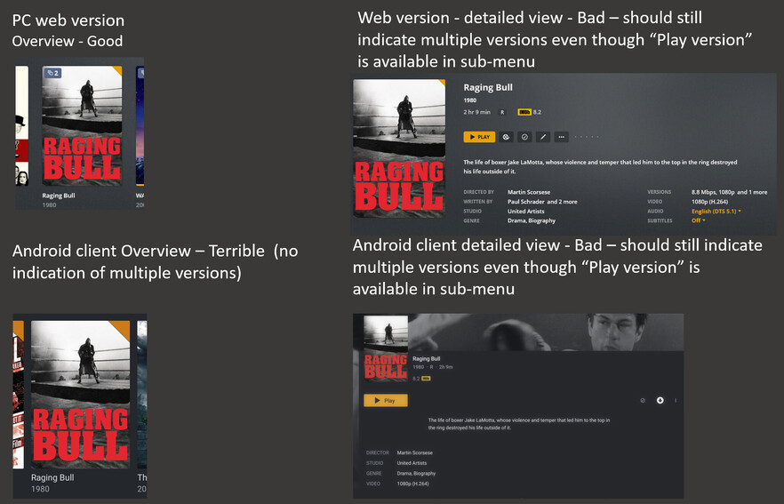 Closely related to this is when you are adding extra material (trailer, behind the scenes etc) associated with a movie. Doing so without indicating multiple versions of a film is impossible today. Material like this should be sub category called “extra” that perhaps is not being indexed at all.