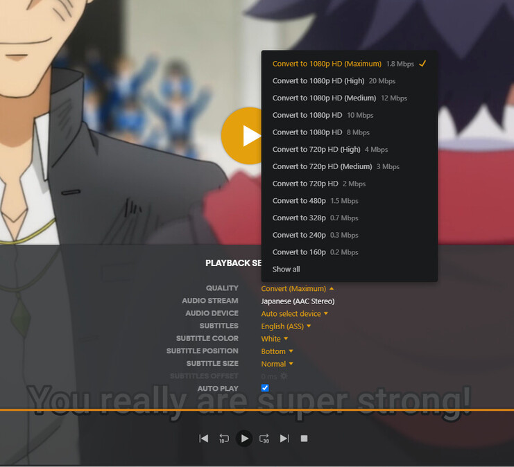 This should just be the installer downloaded from the plex site – not plex from the windows store app. It should function the same as the web client and allow you to select the playback quality.