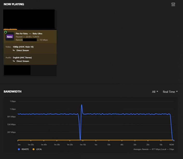 I am running the latest server version: 1.32.7.7571 and I ran into an issue where a single remote stream was saturating my upload bandwidth in 5 minute segments once every 15-20 minutes or so. I have gigabit upload and the media file averages 6,250 mbps bitrate, so this still doesn’t make much sense.