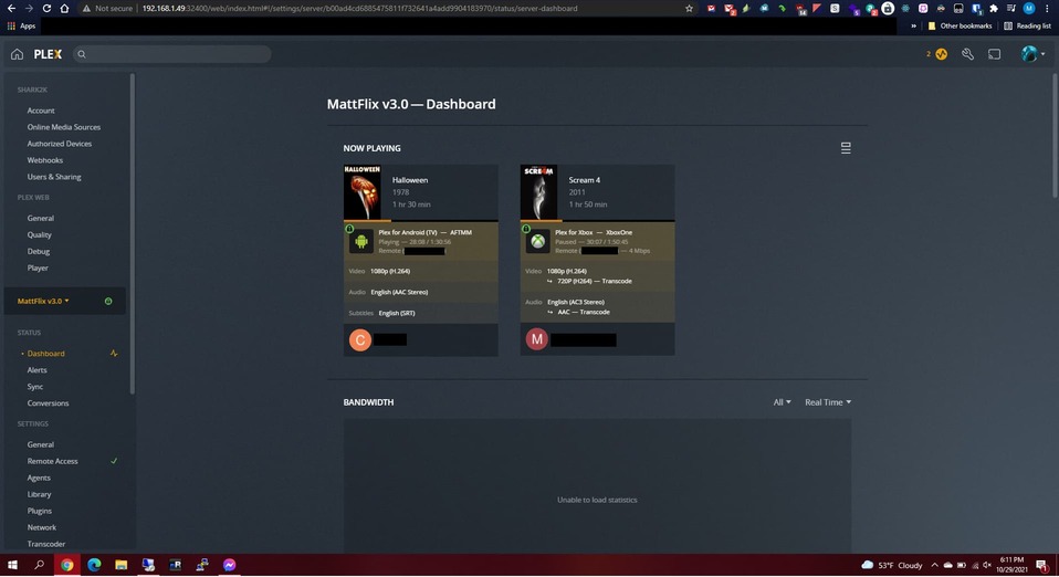 After I saw those errors I went to the dashboard for my Plex server and it was saying unable to load statistics and the bandwidth, CPU and RAM charts were all blank. I’m not quite sure when this might have started but I did run “yum update” the week of October 18th. I thought that maybe something within that update had maybe caused an issue (especially because I didn’t reboot the server after doing that). Because of that and noticing this issue yesterday, I ended up rebooting the server.