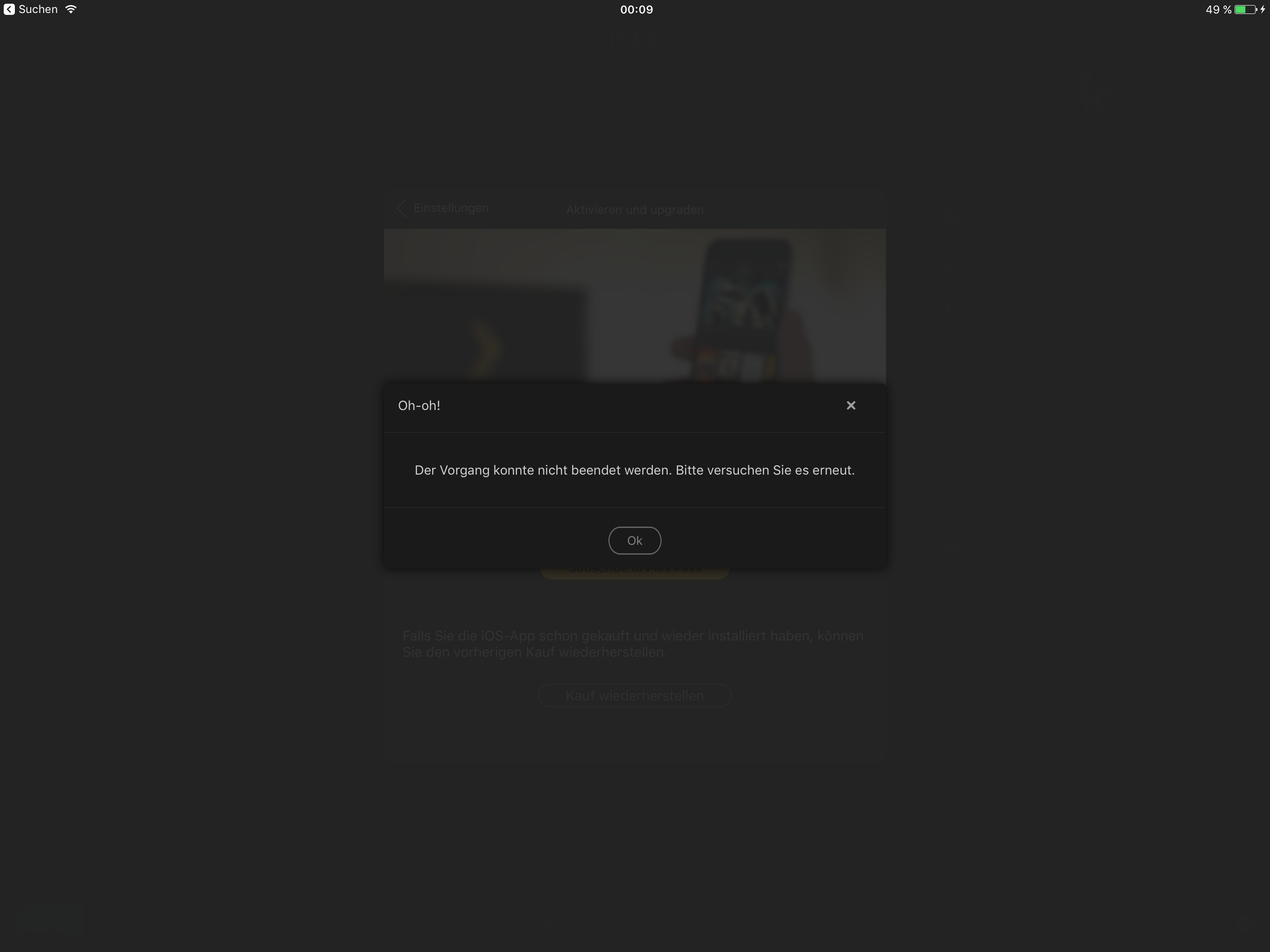 Ich habe mir diese Woche ein neues iPad gekauft und auf diesem alle Daten von meinem alten iPad übertragen. Jetzt habe ich das Problem, dass ich mein In-App-Kauf von Plex nicht mehr herstellen kann. Es kommt immer “Der Vorgang konnte nicht beendet werden. Bitte versuchen Sie es erneut.”