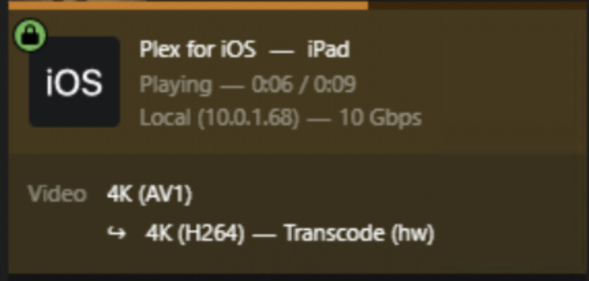 Gotcha - it’s not hardware decoding - although it is using hardware encoding to pipe the file back out as H264 (to my iPad, which oddly should just be able to take AV1 as-is i believe?).
