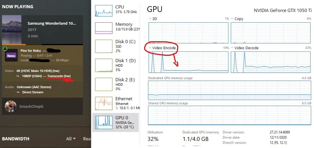 even with tone mapping off i cant seem to get any 4k hdr to process properly with my gtx 1650. it just constantly pauses on client devices, but gpu usage is at 10 to 20 % . ive tried old drivers newest drivers… if i unselect hardware encoding then my cpu actually kicks in, but one of my 10 core e5 xeon cant quite keep up. and plex doesnt seem to want to use my other cpu on the other other numa node… i have plex pass and am on latest version of windows server. if anyone can chime in why my gpu wont process 4k content? even on the spec sheet it says the gtx 1650 should be able to do 3 streams at 4k