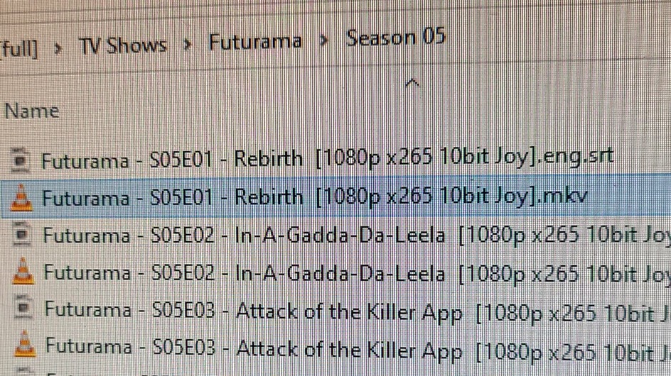 Everything was working nicely, until I noticed that Plex had named the first four episodes of season 5 as the Futurama movies, which I had over in their own specials folder. Season 5 episode 1 was pulling from the correct season 5 episode 1 file, but Plex was using the metadata for one of the movies.