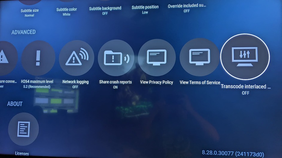 I assume you mean under the “Advanced Settings” group then? I don’t see anything with the words “Transcode” or “Interlanced” in my Plex Android settings, running 8.28. I also don’t see any similar settings on a Roku box either.