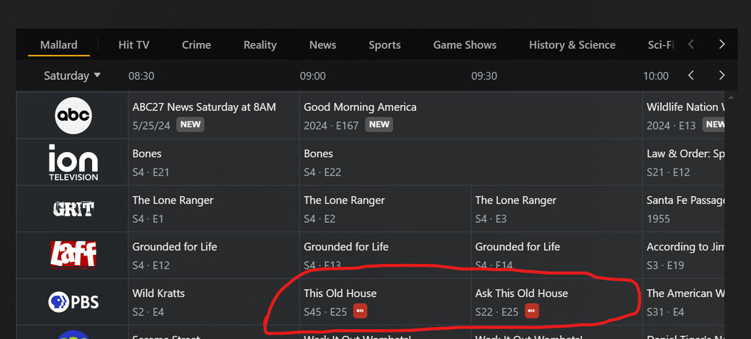 Out of curiosity, can you pick up other PBS stations? Here in Maryland, new episodes of ToH & AtoH air on Thu evenings. Some of “side” PBS channels will rebroadcast on Sat. I don’t recall if they show up as new or not. I know this coming week, the Thu episodes are marked as New, at least in my DVR guide