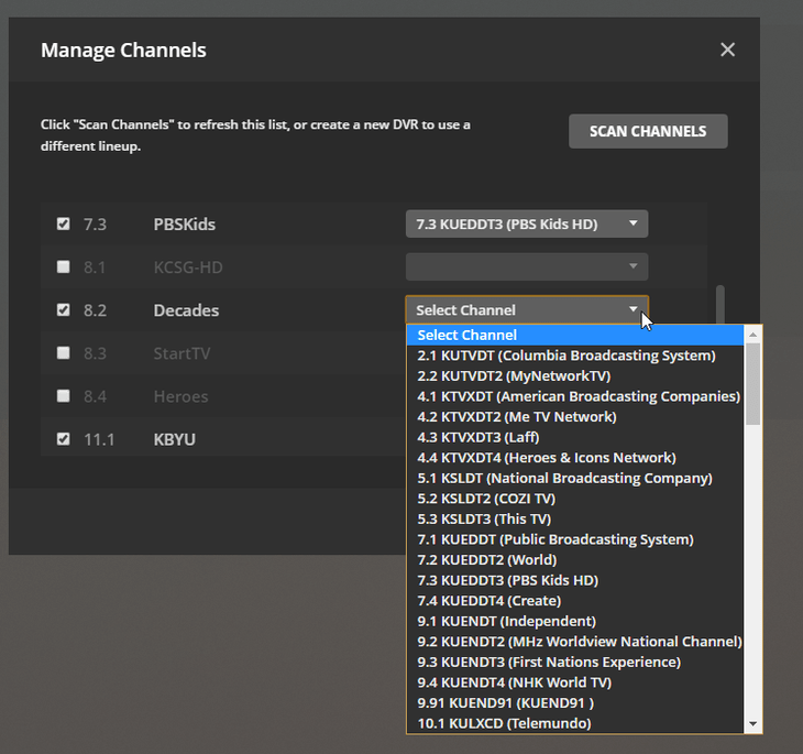 Just deleted the DVR in Plex and recreated. At first, nothing resembling the channels in my local area appeared in the guide. I am using 2 HDHomeRun tuners and the proper channels were found in the scan.