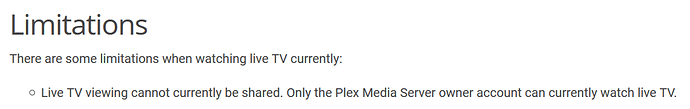 I have been a Plex Pass user for years and I very much enjoy the benefits of it. After following the progress of the new DVR and Live TV I decided it was time to purchase a HDHR tuner and take this for a test drive. It works great but to my disappointment it seem only the account holder can view live TV, What gives with this? How is a family of 5 with kids supposed to use this system? When is this going to support all my users???