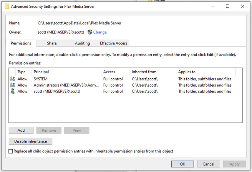 If you have run Plex server with “Run as Administrator” during your struggle, the file/subfolder access permissions inside of this folder might have been partially changed to the Administrator user account. Which then prevents Plex server to access/change them, when started normally.