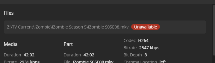 I am creative that way. Until this last update when I moved a subfolder structure from s:\current TV\iZombie to t:\canceled TV\iZombie then ran “scan library files” Plex would delete all iZombie pointers from the menu current TV and build a new structure of pointers to “canceled TV”. Well it actually seems that a few revisions back it started moving metadata and deleting and recreating. But I didn’t really dig into exactly what was happening. But it seemed like it didn’t take as long as before and my played markers were maintained. So there was a time way back when, that after a move I had to go and mark as played for the new location. That seems to not be needed now. The problem now is that all of the old pointers remain and are just marked as “unavailable”.