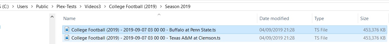 Another EPG issue with sports. I’ve recorded 3 football games in the past week…1 NFL and two college. All had correct “team x vs. team y” EPG when I recorded them. All 3 of them show up as Full Color Football in Plex after the recording completes. Plex then “meshes” the games together making it look like only one recorded. It show up as two different versions of the same recording. (in the graphic I had already deleted one of the games so only two games are left…as you can see the screenshot of the show one of the recordings is Clemson vs. Texas A&M and not some history of football show). I never had this issue with the old EPG.