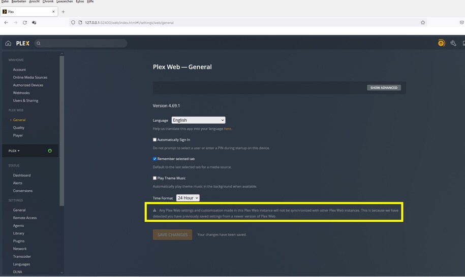 At config it is now mentioned: Any Plex Web settings and customization made in this Plex Web instance will not be synchronized with other Plex Web instances. This is because we have detected you have previously saved settings from a newer version of Plex Web.
