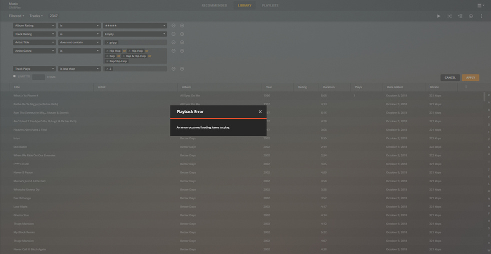 I’ve tried to limit the number of filtered tracks, change filters around, re order the filters, and so on but I always get the error when trying to shuffle. I can add the filtered tracks to a normal playlist and shuffle just fine but it won’t updated the playlist after i rate tracks like the smart playlists do.