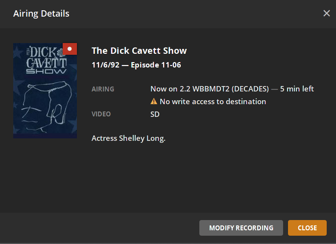 I’ve been trying to setup DVR for around 6 hours now, and I keep hitting the same roadblock. Whenever I set something to record I get the message No write access to destination and a little amber caution symbol over the show.