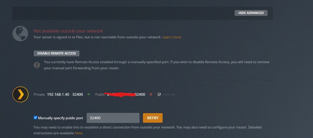 Plex showing that it is now not accessible from outside. In local home all is fine.