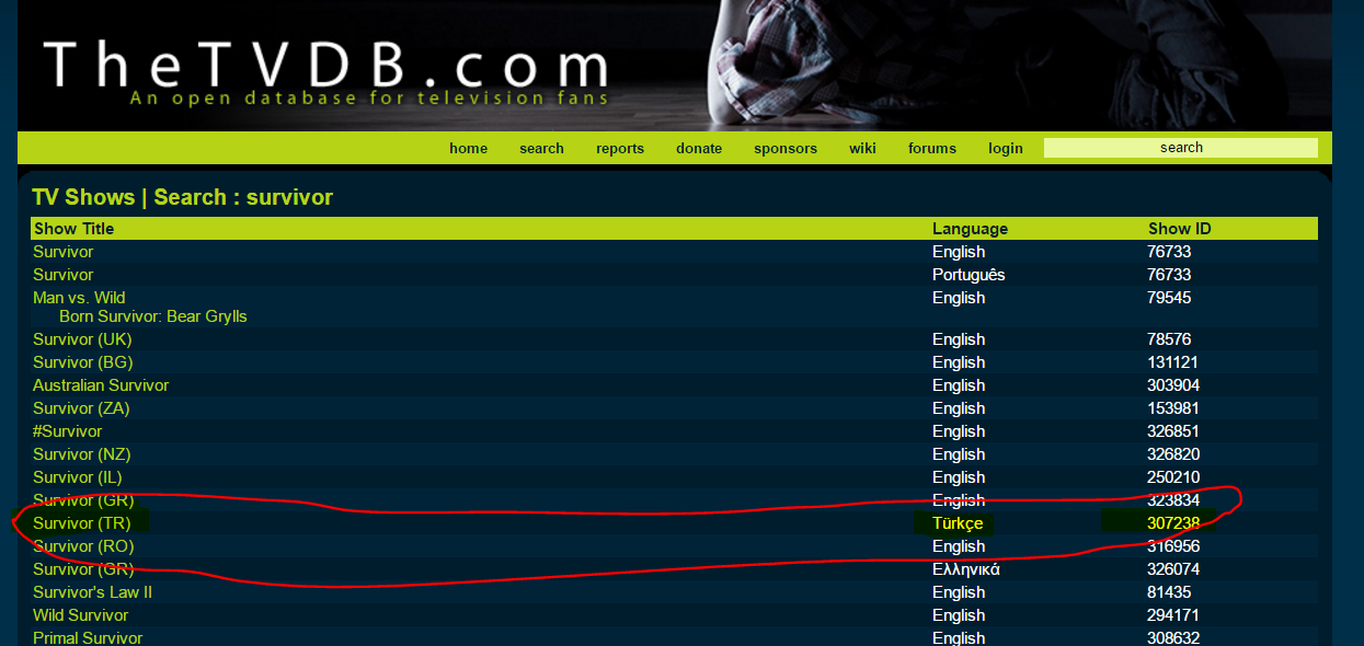 Oh interesting, ID is 76733, not 307238. So what’s that? http://thetvdb.com/?id=307238&tab=series Some Turkish? version of Survivor. But it’s just listed as Survivor on that page. However, when you search Survivor at TVDB using the web UI, it shows up as Survivor (TR).