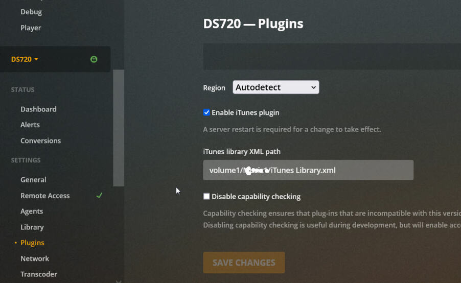 It took me a bit to go back to my captures of how I did the XML iTunes so Playlists would come in the way it needed to be done. Here is a capture from Feb 20, 2022, Plex DS720 version of 1.24.0.4921. As you can see, the Plugins navigation shows in Settings for the DS720. You’ll notice to the right is a box to enable iTunes plugin.
