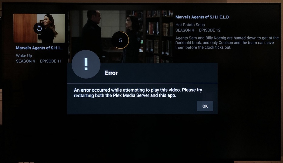 Problem: Play “Up Next” does not work. After a TV episode, it shows the “Up Next” screen with a countdown but an error message pops up reading “An error occurred while attempting to play this video. Please try restarting both the Plex Media Server and this app.” After the countdown, the screen behind the error message goes black but the error message remains.