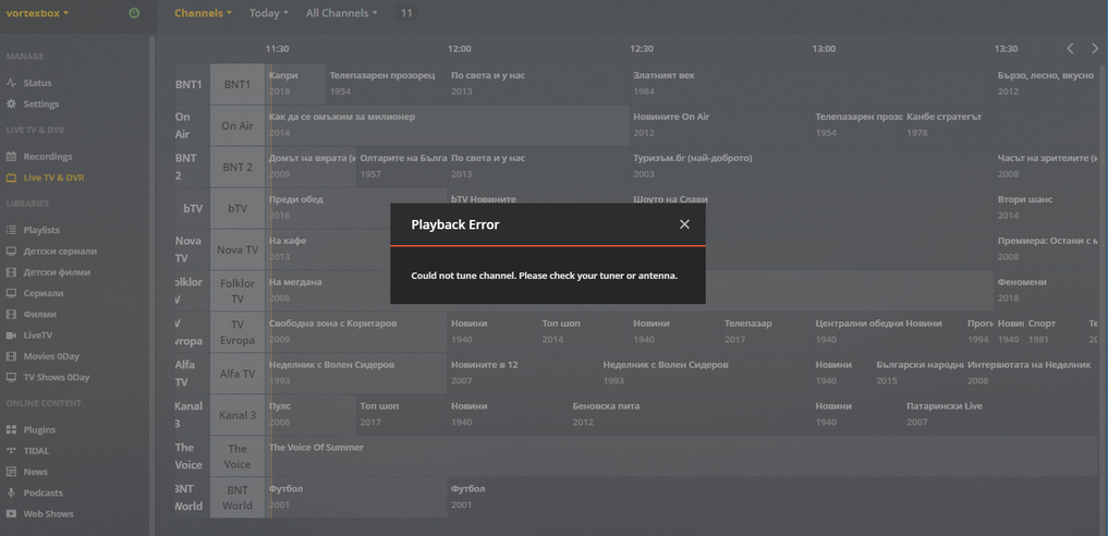 I have a differetnt issue. I have two machines running PMS One is a Qnap TVS-673e NAS and it is running tv shows Movies other Videos while the other is a old dell laptop (studio 1555) win 7 and it is used for live tv and dvr using haupppauge dual head. I had to use some generic EPG to be able to watch tv worked fine but only 5 channels matched but it worked fine exept 2 hd channel witch it didnt play most of the time but that is not the issue. Now i finally sorted the epg using webgrab all but 3 channels match but now it wont play any of the channels. I just get the Could not tune channel. Please check your tuner or antenna Error even though the tuner works fine with its own app (win tv) I restarted all the machines but still the same error. HELP PLEASE. Did anyone have a same issue? @support