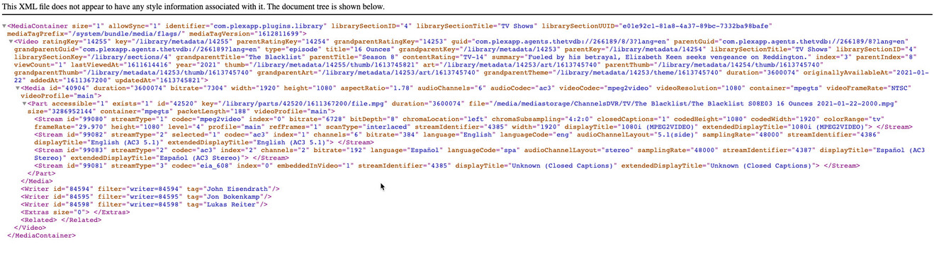 Mar 10, 2021 14:37:35.890 [0x7fc7e2326700] Debug — Completed: [192.168.1.164:56093] 200 GET /library/metadata/14119/children?excludeAllLeaves=1 (10 live) TLS GZIP Page 0-3 9ms 2443 bytes (pipelined: 2)