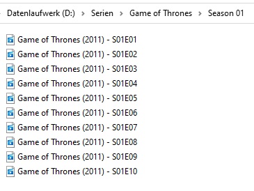 Versuch es mal mit Games of Thrones S01E01 oder Games of Thrones - 01x01. Kann man ja erst einmal an einer Folge testen ob es klappt.