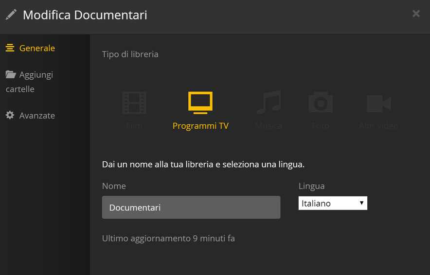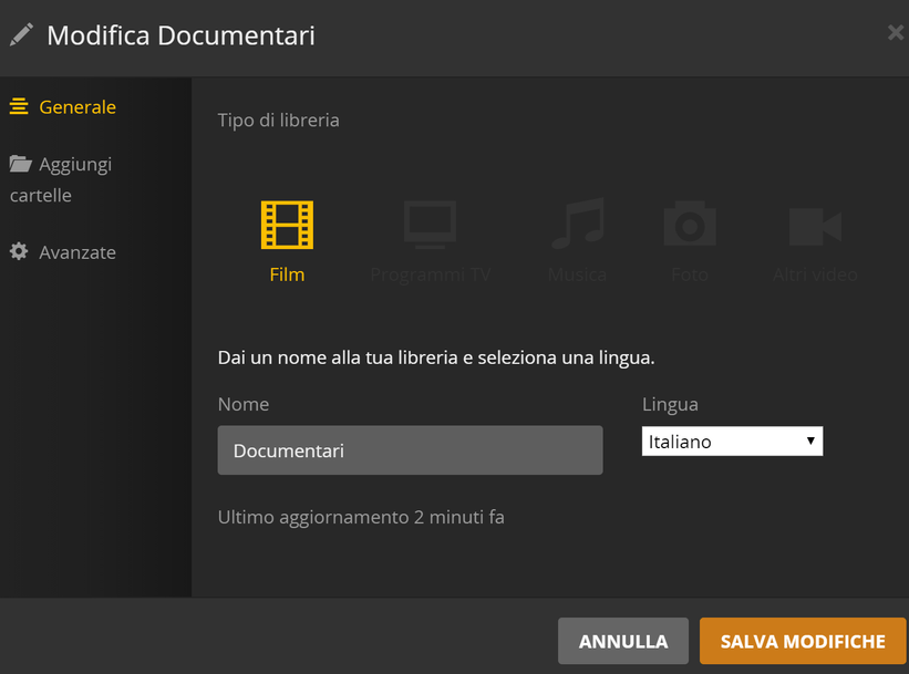 What type of Plex Library is Documentari in? The Plex Library needs to match the actual content of that folder (are those TV Shows found in http://thetvdb.com/ or Movies foundin http://themoviedb.com?)