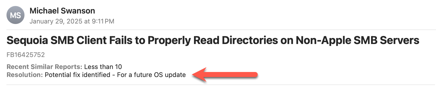 I’d be curious if the nsmb.conf file I’ve shared works around your issue too. If it’s easy for you to try, it’d be one more data point that I can add to the bug report I’ve filed.