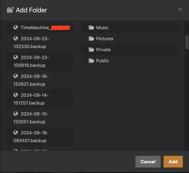 @Atomatth@drzoidberg33… not sure if this is related, and I know it’s not SMB related, but figured I’d report as a datapoint. I’m also not sure if this is normal, since I have not added a library in quite a long time so I haven’t seen this screen for a bit, until this issue popped up. But when I go to add the folder again for my affected movie libraries, Plex is seeing all my TimeMachine backups that reside on my TimeMachine USB drive.