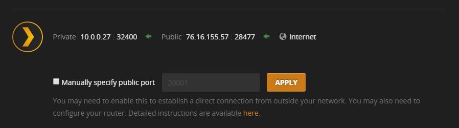 I’ve added a ‘service’ in the Port Forwarding section of the Gateway configuration, for port 20001, and then assigned 20001 as the manually specified public port in Remote Settings. When I first Apply that port, I get a message that my server is fully accessible outside the network. But when I revisit the page to check, I see 'Not available outside your network. Your server is signed in to Plex, but is not reachable from outside your network. '.