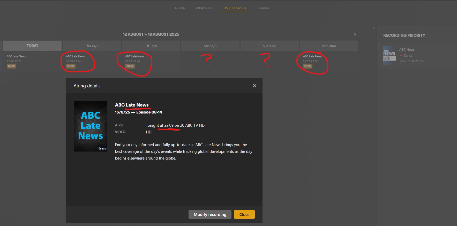 However, when I look in the DVR Schedule, it shows a News programme from a different timeslot has scheduled to record instead - that of “ABC Late News” from ABC TV HD, Ch 20, at 2209 AEST: