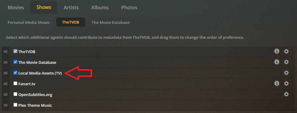 You may also run into issues with embedded metadata. If the metadata is incorrect, it can cause Plex to misidentify or misorganize a show. In Plex Media Server settings for Agents → Shows, drag “Local Media Assets” to the bottom of the list. The refresh the metadata for the show.