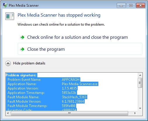I have noticed after installing Plex Media Server on my Windows 7 Pro PC (has all latest updates) that intermittently a crash occurs and Plex Media Server stops responding until it is restarted.