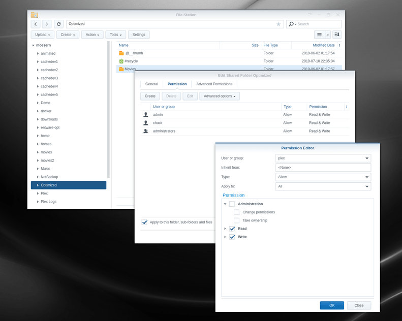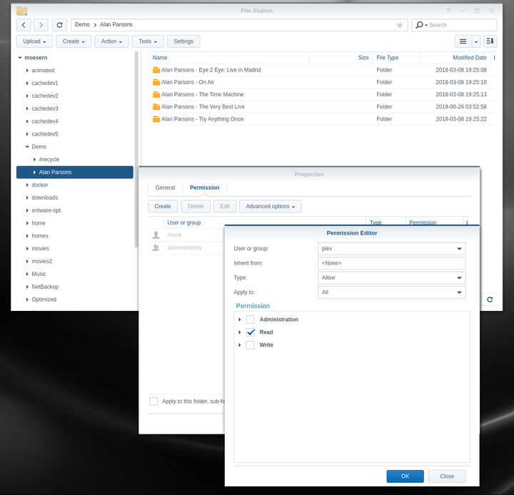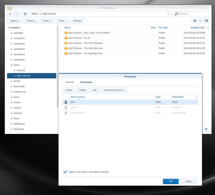 In this screenshot, I am adding user plex to a folder (and subtree) where it previously had no permission. This is common when copying from remote sources.