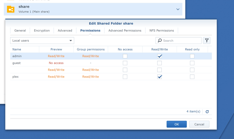I have tried having the plex user with both RW and R permissions to my share
