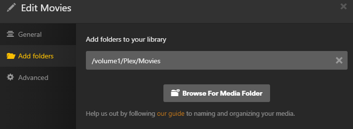 You will then move Movies, Music, TV Shows, & Videos from the Plex shared folder to the new shared folder. The paths in Plex Media Server will look like /volume1/media/Movies, /volume1/media/Music, etc.