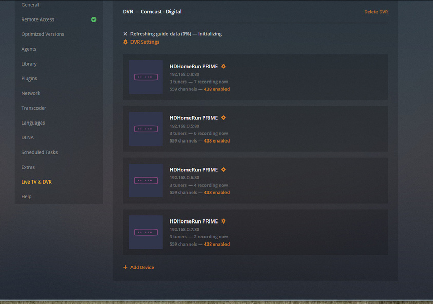 chuck the network consists of the cable modem to router to gibabit switch then to the server and other devices. 2 servers, 4 hdhomerun primes, 2 computers all wired with shielded cat5 cables all gibabit connections. the video is to large to upload. it takes average 2+ minutes to load the recording screen and 1+ minutes to load the guide screen on chrome web app from server to pc. pc has I7 4930 3.4ghz 6 core with 16gb ram gibabit connection and ssd main drive for operating systems as well as 12 tb raid for file storage. it also takes average of 15 + minute when guide updates as well as 5+ minute when you do scan library update as well as it downloading and updating metatag items. even after doing daily procedure as you described prior. Plex Media (15.6 MB)