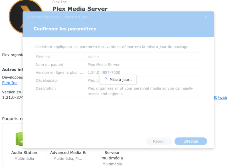 My problem now is that when I try to install manually the plex package, the process remains blocked for > 25 minutes (I mean that updating animation never ends). Usually, this operation takes 30 seconds at the most.