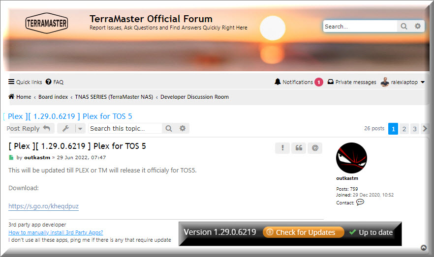 Just a Note: The Plex Media Server updates that were once provided by TerraMaster for TOS 5.0 is no longer free. The Plex Media Server updates provided by Plex will only work on TOS 4.0.