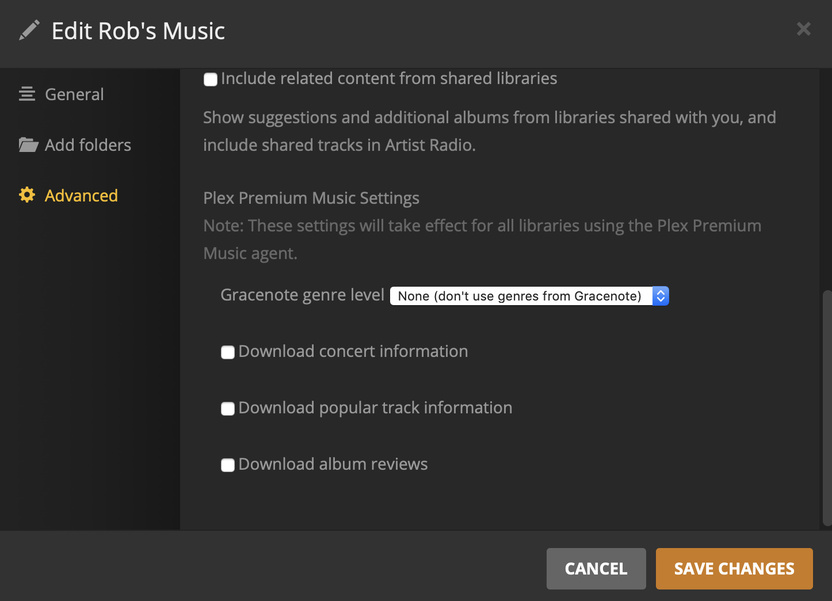 I can’t turn off Last.fm or Plex Premium Music as the options are greyed out. I have unchecked all of the checkboxes within the configuration, however.