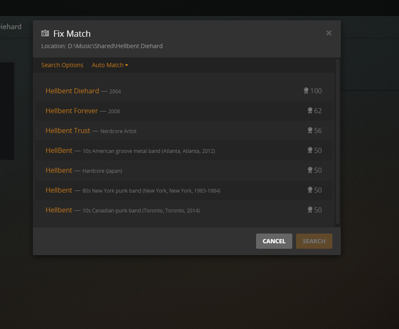 Another error I noticed, bands added to musicbrainz (who do not have Allmusic data) are not matching at all, despite being found by the agent (example being used is Hellbent Diehard):