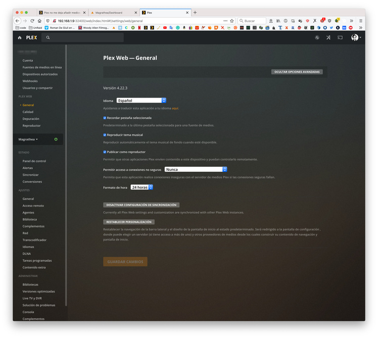 Buenos días, he instalado plex server ( la última versión que se ofrece en la web ) para Windows. Entro con mi usuario pero no me deja añadir bibliotecas. Si doy a “Mis medios”, en lugar de permitirme introducir nuevos medios, me indica que me descargue Plex server y lo instale en el servidor cuando la realidad es que ya está instalado. Decir que en otras ocasiones lo he instalado en otros ordenadores y no he tenido ningún problema. Es como si esta versión no fuera servidor…