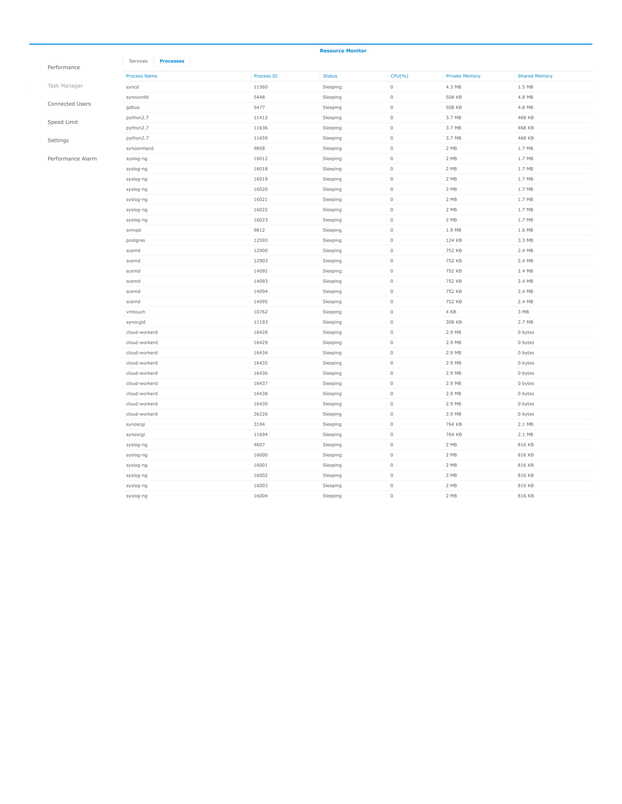 The Synology “Process” report shows the threads which are active. Notice the lower memory usage.
