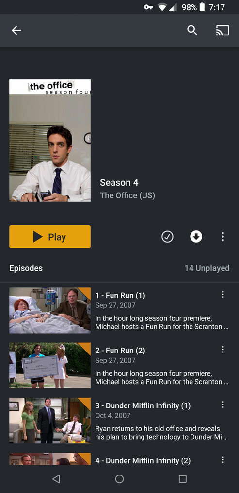 I’ve been digitizing my bluray copies of The Office for the past few weeks. Just completed Season 4, and I notice some odd behavior out of Plex. Office fans will know that the first 4 episodes of Season 4 were double episodes, as well as the season finale. TVDB aired order lists them as two separate episodes (https://www.thetvdb.com/series/the-office-us/seasons/official/4?force_isolation=true) while the DVD order lists them as single episodes, the way they are on my discs (https://www.thetvdb.com/series/the-office-us/seasons/dvd/4). However, as you can see from the screenshots, Plex appears to be attempting to use both despite being set for DVD order - Episodes 1 thru 4 are displayed as Fun Run (1), Fun Run (2), DMI (1), and DMI (2), before Episode 5 is correctly displayed as Local Ad. The correct names are displayed until Goodbye Toby, which shows up as The Chair Model instead.
