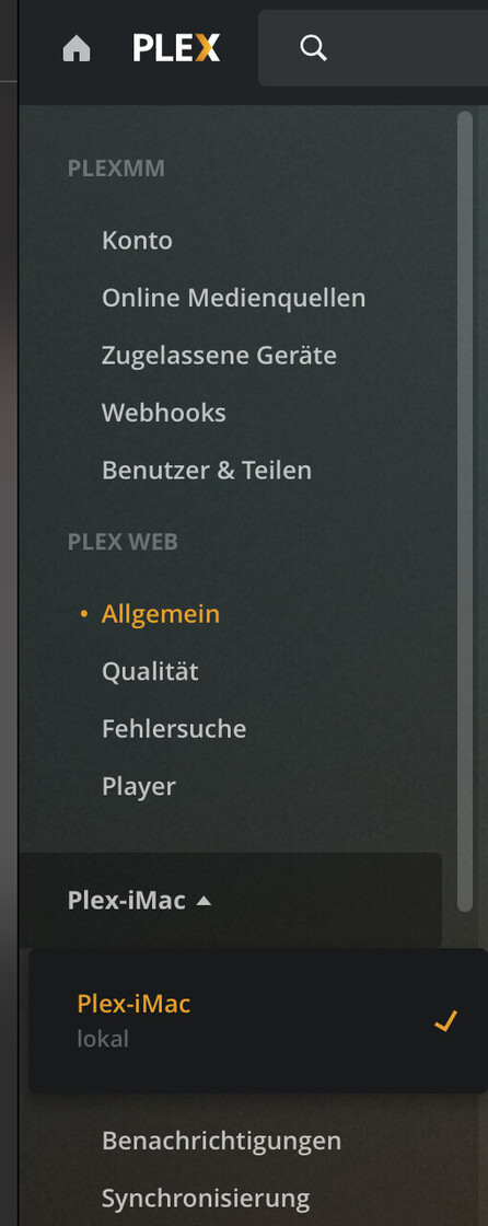 Du hast kannst in den Einstellungen links den etwas dunkleren Balken mit dem Servernamen Plex-iMac erkennen. Über den Dropdown daneben kannst du üblicherweise zwischen deinen Servern wählen und deren jeweilige Einstellungen vornehmen. Das „indirekt“ darunter sagt, dass du im Moment keine direkte Verbindung zwischen Plex Web und dem Server hast