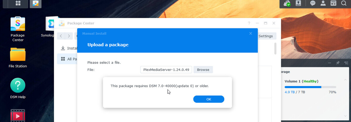 When I select the file to install it I get a message saying This package requires DSM7.0.0000 (update 0 or older.