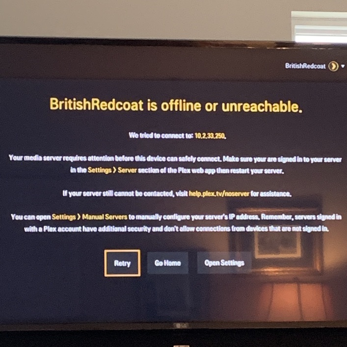 My plex server is on my Macbook. It is linked to my LG TV. However, I get an error that the server is “OFFLINE OR UNREACHABLE”. The IP and Port is correct. Plex server is showing the LG TV as an authorized device.