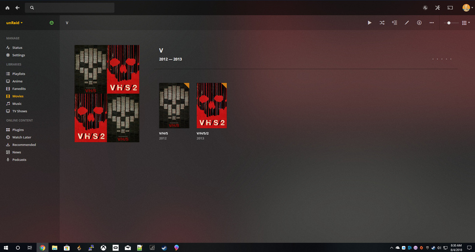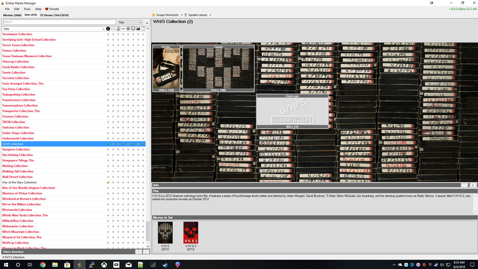 I’m running Plex on an unRaid server and just noticed that my collection of the V/H/S movies, entitled ‘V/H/S Collection’ is listed multiple times in the movie list. It shows up as independent ‘V’, ‘H’, and ‘S’ collections consisting of the movies. When viewing the actual movies V/H/S and V/H/S/2 it shows they belong to the ‘V’ collection. The movie are correctly parsed individually, just not in the collection name.