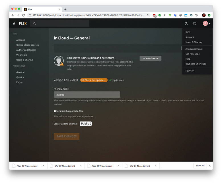 I then go to settings and the server inCloud is visible but showing as unclaimed
